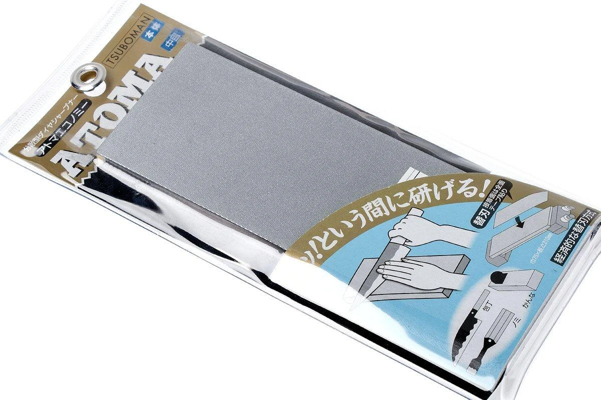 Cette Atoma Diamond Stone est une pierre à aiguiser diamant de haute qualité de fabrication japonaise ayant un grain moyennement grossier. Vous l’utilisez pour rétablir la lame très abimée d’un couteau ou d’un outil tranchant ou pour rétablir le morfil. Cette pierre Atoma est aussi utilisée comme pierre à redresser pour aplanir vos pierres à aiguiser classiques.