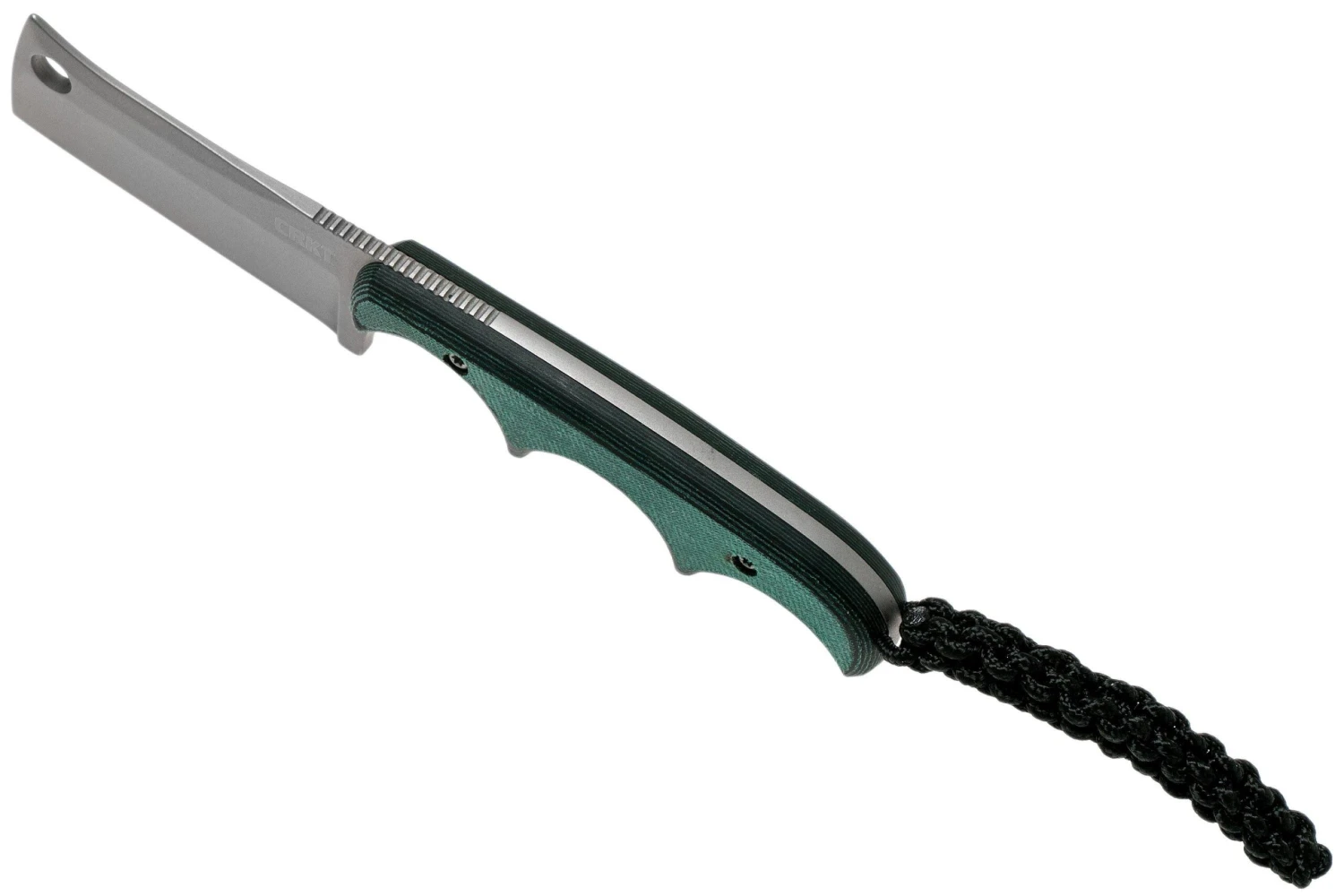 Le CRKT Minimalist Cleaver 2383 est un couteau de cou ergonomique conçu par Alan Folts. Le manche du Minimalist est vraiment intéressant. Les empreintes offrent une prise en main très confortable à trois doigts. Le petit doigt, quant à lui, s’enroule autour du lanyard pour une prise avec toute la main. Pour le positionnement du pouce, un jimping est placé sur le dos de la lame. Il s’agit de petites rainures sur le dos de la lame qui permettent une meilleure accroche.
