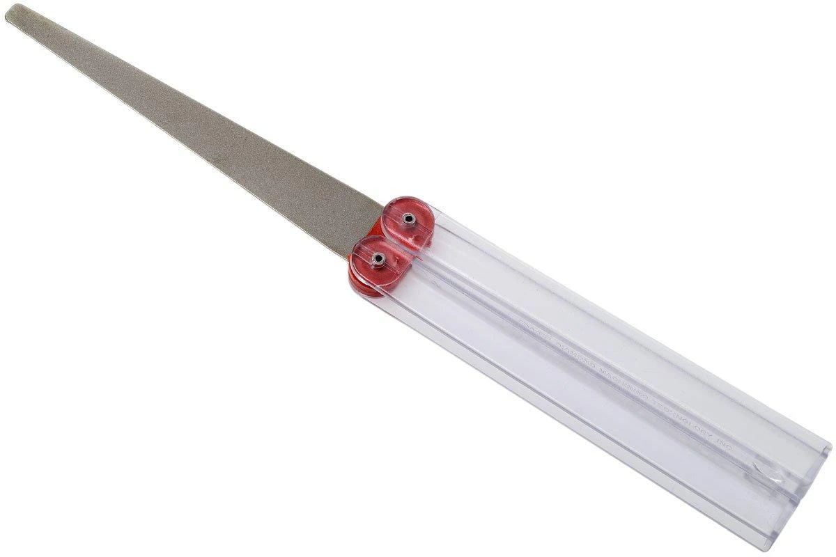 Cette lime diamant DMT DiaFold est extrêmement pratique pour aiguiser des outils qui se laissent aiguiser difficilement. Comme les embouts, sécateurs et autres outils de petite taille. La lime n’est épaisse que de 1,5 mm à la pointe pour atteindre progressivement 6 puis 19 mm. La lime est pourvue d’une surface d’aiguisage diamant sur une face. Avec sa granulométrie fine, cette lime permet de perfectionner le tranchant d’une lame déjà aiguisée.