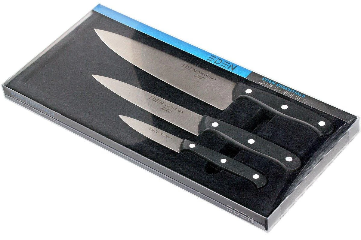 Le Couteau de chef Eden Essentials, couteau universel et couteau d’office sont le trio idéal pour presque tous les défis de pelage et de coupe. Le couteau de cuisinier comme un cheval de trait avec lequel vous pouvez réduire la taille de presque tous les produits. Le couteau universel est utilisé pour de nombreuses autres tâches pour lesquelles le couteau du chef est trop gros et le couteau d’officier prend en charge les petits travaux précis. Avec cet ensemble de couteaux vous avez tout pour effectuer toutes les tâches de coupe et d’épluchage.