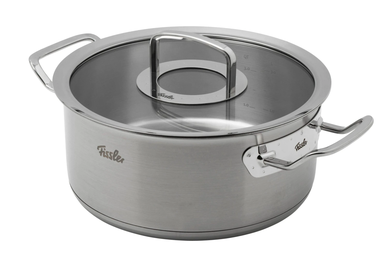 Cette cocotte Fissler Original Pro Collection fait 24 centimètres de diamètre et peut contenir jusqu’à 4,6 litres. La graduation interne va jusqu’à 3.0 litres. Elle est livrée avec un couvercle en métal et en verre.
