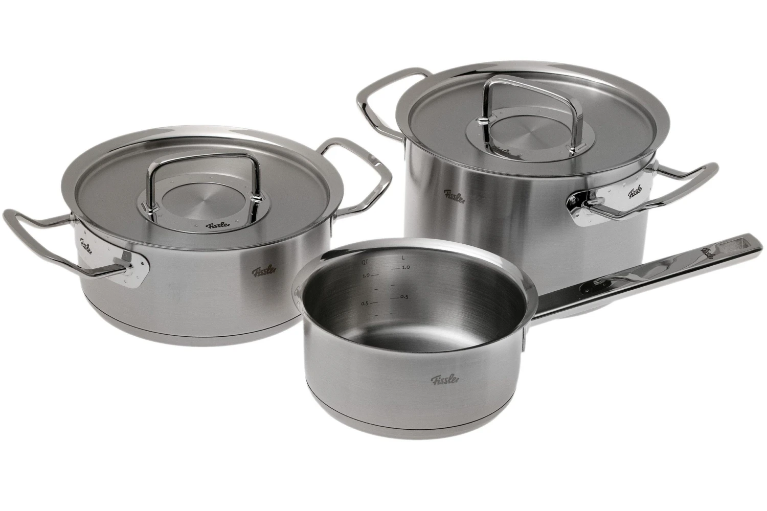 Cette batterie de casseroles Fissler Original Pro se compose de 3 parties : une casserole, une cocotte et une casserole à queue. La poêle et la casserole sont équipées d’un couvercle. Contenu exact de l’ensemble :