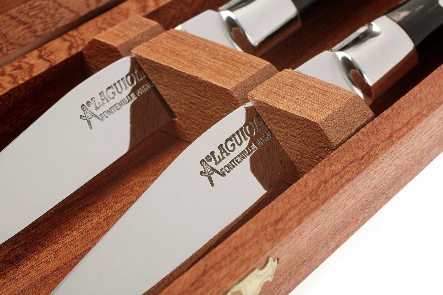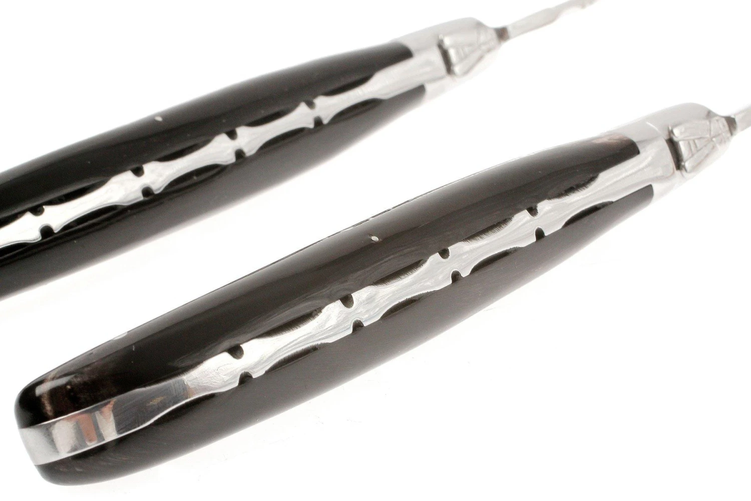 Ce set de couteaux à steak Fontenille Pataud est composé de deux couteaux de table Laguiole avec manche en corne de buffle. Un matériau rare et cher. De plus, Fontenille Pataud n’utilise que les pointes des cornes, car elles sont plus ‘pleines’ et donc plus chères que le reste de la corne.