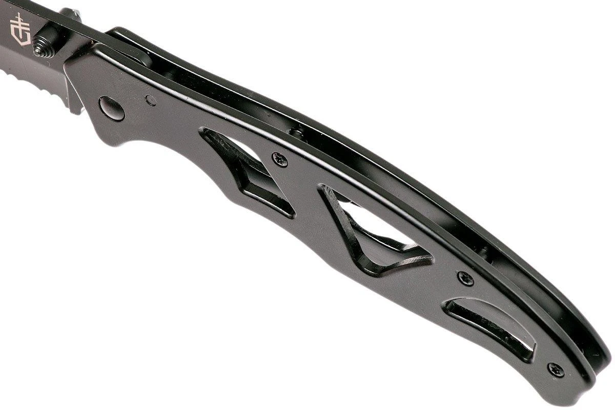 Le Gerber Paraframe II Tanto est une version plus grande et tactique du Paraframe classique. Ce couteau de poche est entièrement noir, et est dotĂ© d’une lame partiellement dentelĂ©e et pointue. Le cadre ouvert rappelle celui du Paraframe. Non seulement ça l’allège, mais cela permet Ă©galement de faciliter le nettoyage du couteau de poche. Un couteau de poche EDC tactique surprenant.