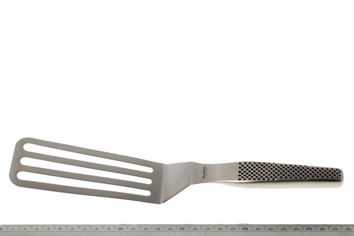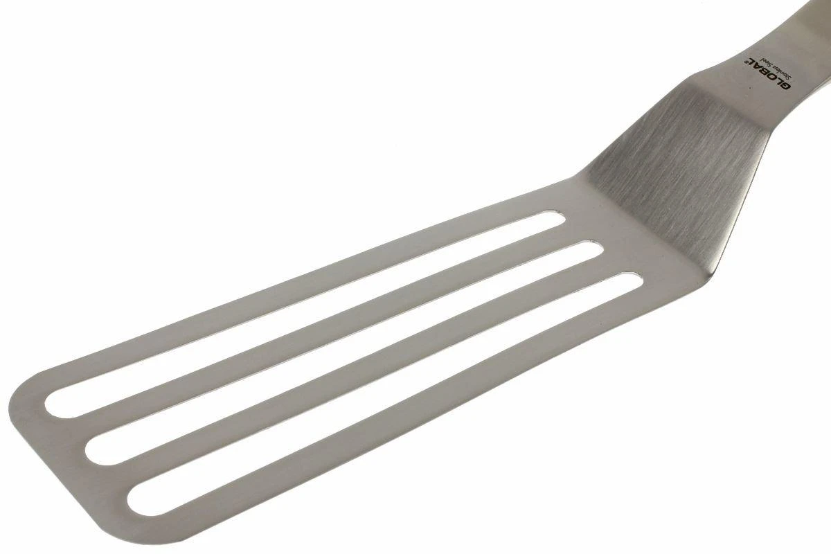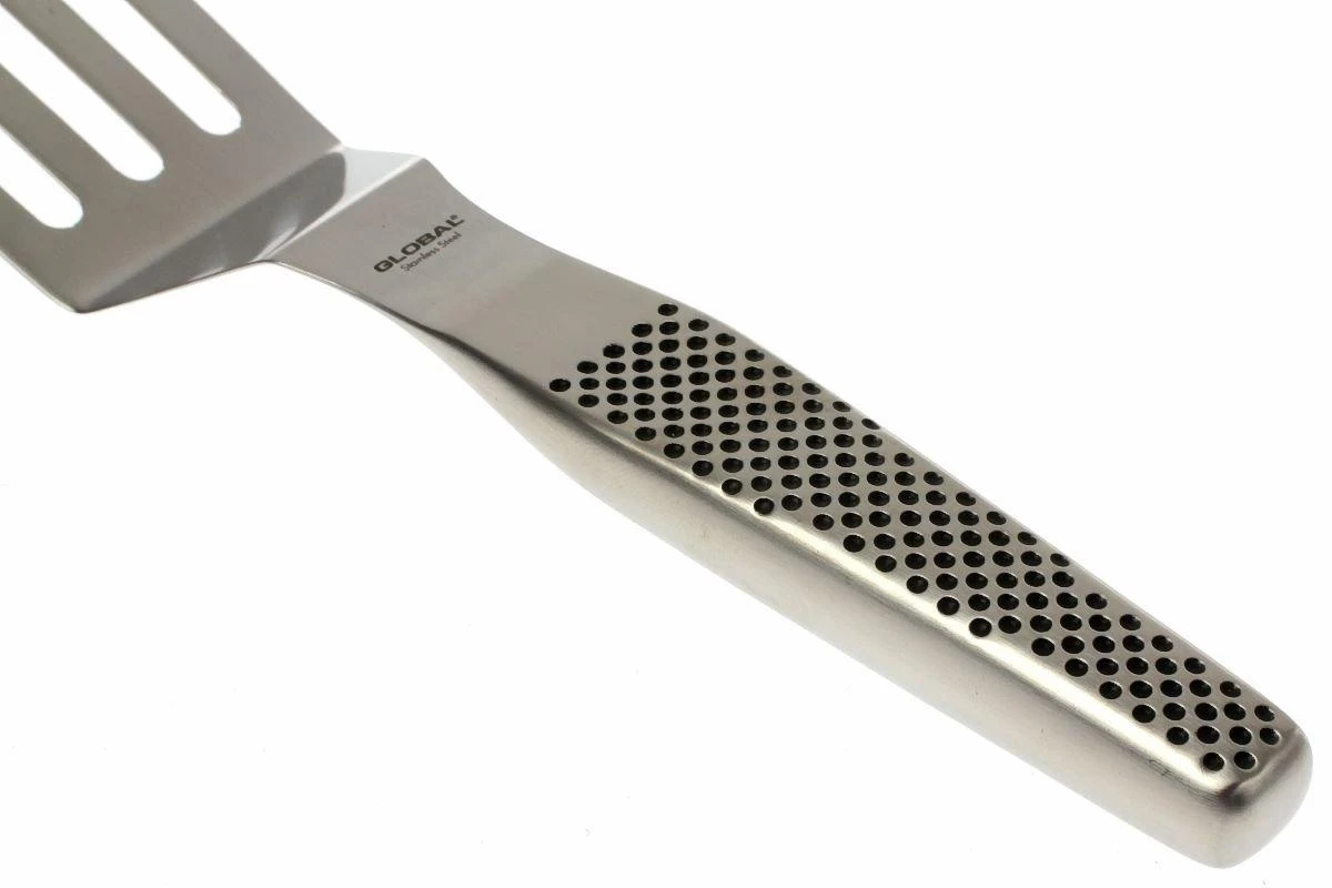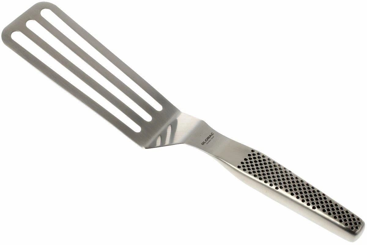 Steaks, œufs au plat, crêpes, bacon, quoi que vous cuisiniez, cette spatule coudée Global permet de soulever, retourner et déposer dans l’assiette. Les trous dans la spatule viennent filtrer tout excès de liquide ou de gras.