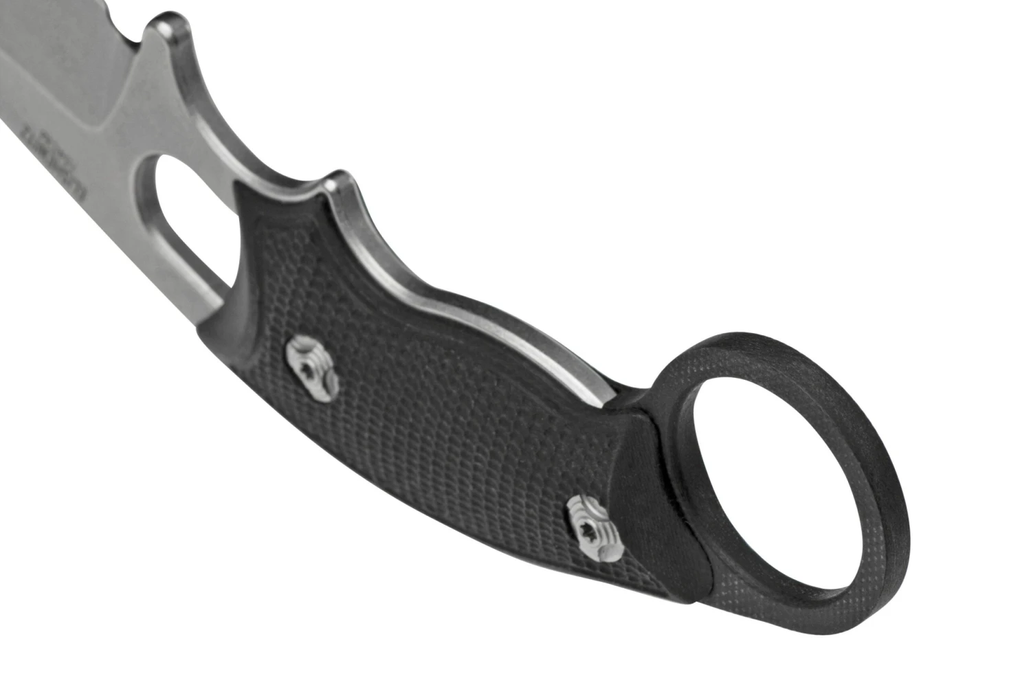 Le Hogue EX-F03 est un couteau de cou léger, conçu par le coutelier Allen Elishewitz. Ce couteau est en acier 154CM, et est doté d’une finition stonewashed. À l’extrémité du manche, on trouve un œillet de cordon avec un morceau de corde nouée. La large ouverture dans le manche allège beaucoup le couteau, ce qui est parfait pour un couteau de cou. Cela offre également la possibilité de recouvrir le manche de paracorde. Pour un couteau de cou, ce modèle est assez imposant. Souvent, un couteau de cou n’est pas très maniable quand on a de grandes mains, mais celui-ci offre une bonne prise. Sa lame avec un tranchant de 5,5 cm est également agréable à utiliser.