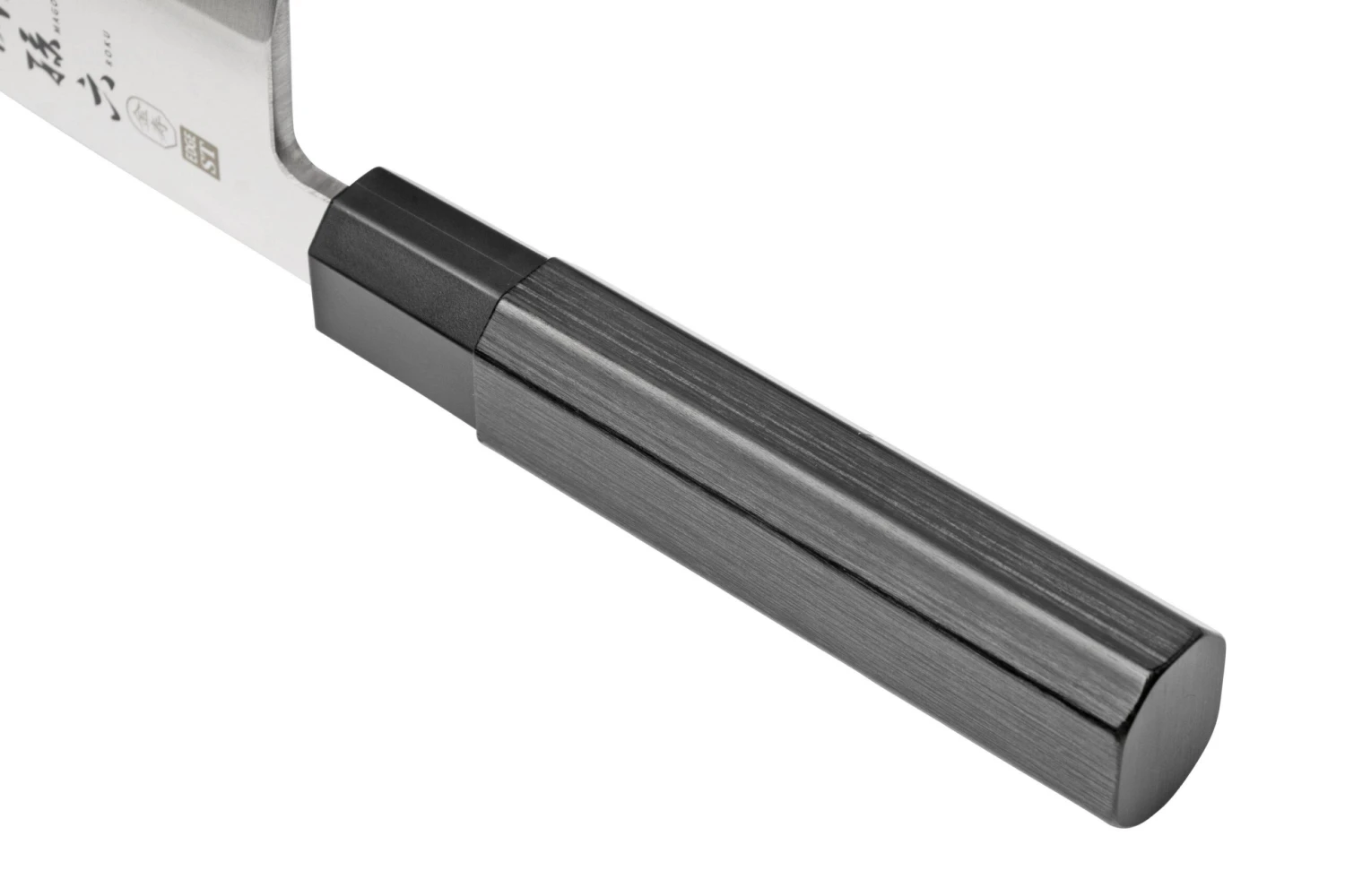 Ce couteau Deba fait partie de la magnifique collection Kai Seki Magoroku Kinju. Ce couteau japonais est spécialement conçu pour couper avec précision les légumes et le poisson. Il s’agit d’un couteau assez gros et lourd, avec une lame large de 16,5 cm de long, au design traditionnel japonais. Un ajout très esthétique à votre cuisine, très agréable à utiliser pour cuisiner. Le couteau Deba est traditionnellement utilisé comme hache. C’est un couteau lourd mais stable. La partie avant de la lame s’utilise idéalement pour lever des filets, et la partie arrière pour couper les petits os et arrêtes.