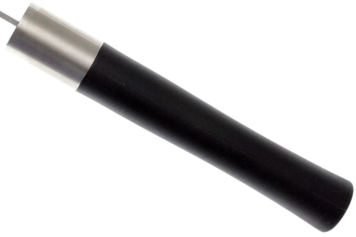 Kai est une marque de couteaux de cuisine réputée pour sa qualité exceptionnelle. La gamme Kai Wasabi permet aux cuisiniers amateurs de s’équiper de couteaux de qualité professionnelle à petits prix. La lame est en acier Daido 1K6, un type d’acier inoxydable durci à 58 HRC. L’absence de mitre vous permet d’utiliser toute la longueur du tranchant. Cela facilite grandement l’aiguisage. Le manche est composé d’un mélange de poudre de bambou et de polypropylène. Il est donc extrêmement durable et résistant à l’eau.
