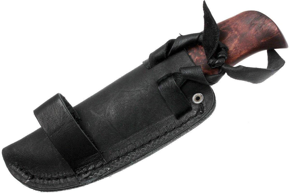 Le Karesuando Vuonjal est un couteau outdoor typiquement Scandinave. Le manche en bouleau madré a été enduit d’huile teintée pour améliorer sa résistance aux éléments. Il est doté d’un insert en bois de renne sur le côté. Celui-ci est décoré d’un joli dessin. La forme ergonomique du manche rend ce couteau confortable à utiliser. La lame en acier 12c27 de Sandvik a une émouture scandi typique, une façon d’aiguiser typiquement scandinave qui rend le tranchant très solide et facile à affûter. Lame et manche sont séparés par une belle mitre en laiton.