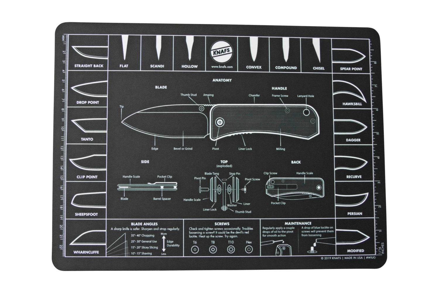 Ce tapis de souris Knafs Knife Mouse Pad est un super tapis pour présenter vos couteaux (ou tapis de souris) avec des informations sur les couteaux. Anatomie d’un couteau, formes de lames, et même une règle en centimètres et en pouces sur le côté. Le dessus est en polyester doux, et le dessous est fait d’une couche antidérapante. Pour un tapis de souris, il est assez gros, et on peut aussi s’en servir pour présenter ou bricoler ses couteaux. Vous avez immédiatement toutes les infos sous les yeux.