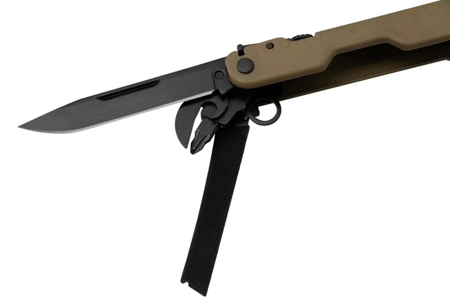 Le Leatherman Super Tool 300M Coyote fait partie de la collection Leathermans Super Tool 300. Le Super Tool 300M est fait pour les tâches militaires les plus intenses et est livré avec un étui en nylon compatible MOLLE. Vous pouvez ainsi l’accrocher facilement sur votre équipement tactique. De plus, la finition matte en Cerakote évite les réflexions sur le multitool. Cela vous permet de rester bien discret lors de vos missions nocturnes.