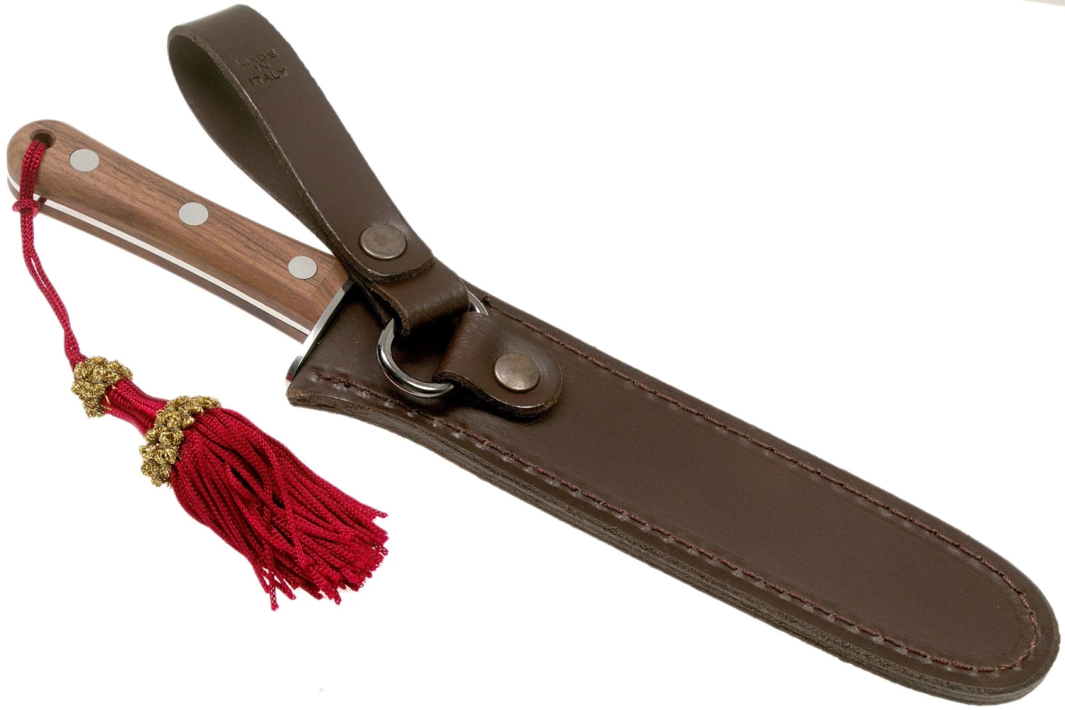 Ce mini sabre à champagne Maserin a été conçu pour servir ! Il est livré avec une housse en cuir pratique avec une boucle pour pouvoir le porter à la hanche. Son petit format n’est pas encombrant. On peut se servir des deux côtés de la lame. En plus d’être une manière super festive d’ouvrir une bouteille de champagne, le pompon au bout du manche donne lui aussi un côté jovial.