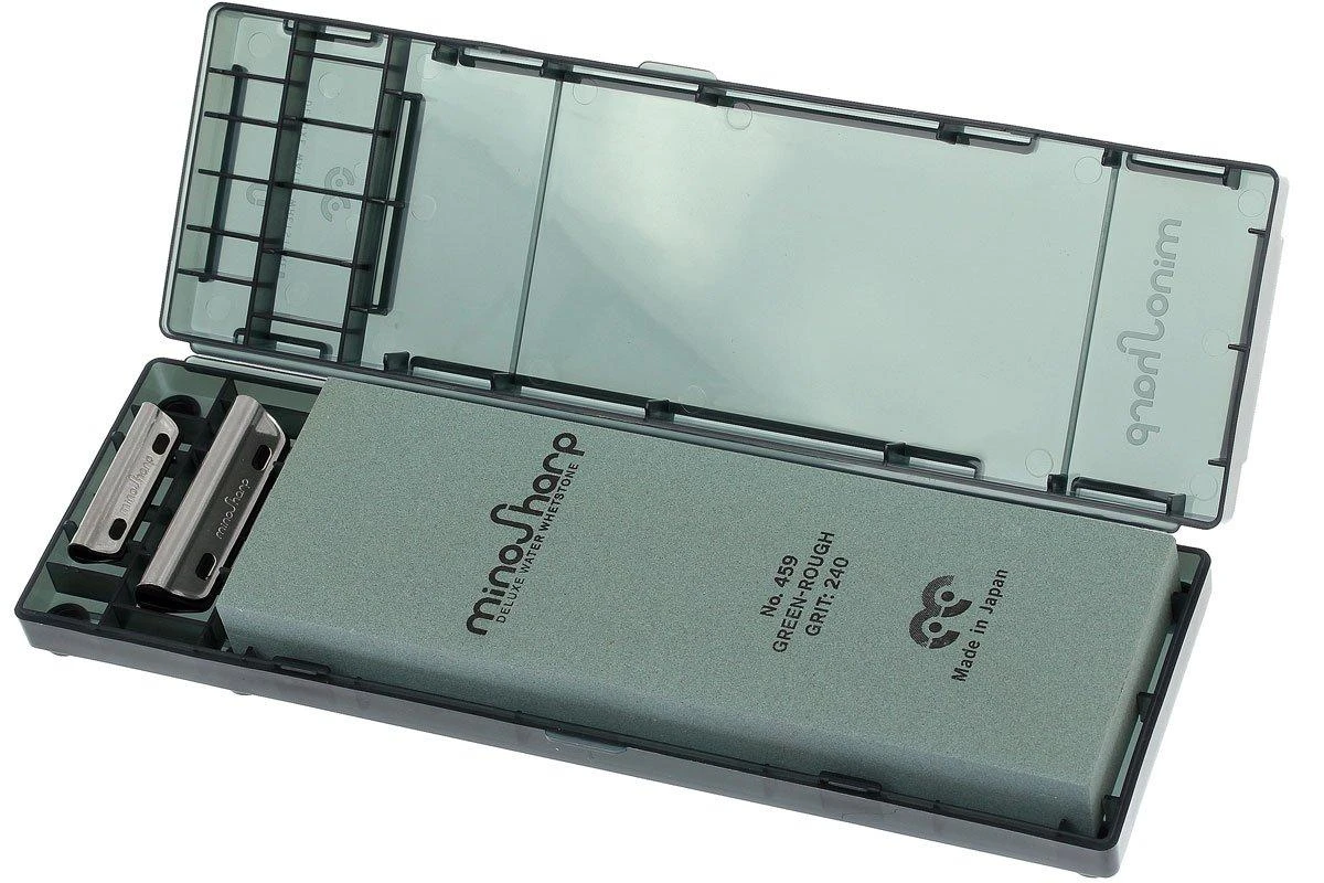 Cette pierre à aiguiser Minoscharp 459 est parfaite pour aiguiser les couteaux Global. On place la pierre 10 à 15 minutes dans l’eau avant de l’utiliser, afin qu’elle se gorge d’eau. Ensuite on peut commencer à aiguiser. Les guides d’aiguisage livrés avec la pierre permettent de maintenir un angle constant pour les couteaux japonais. Cette granulométrie 240 convient particulièrement pour pré-aiguiser les couteaux émoussés dont la lame est endommagée ou très émoussée.