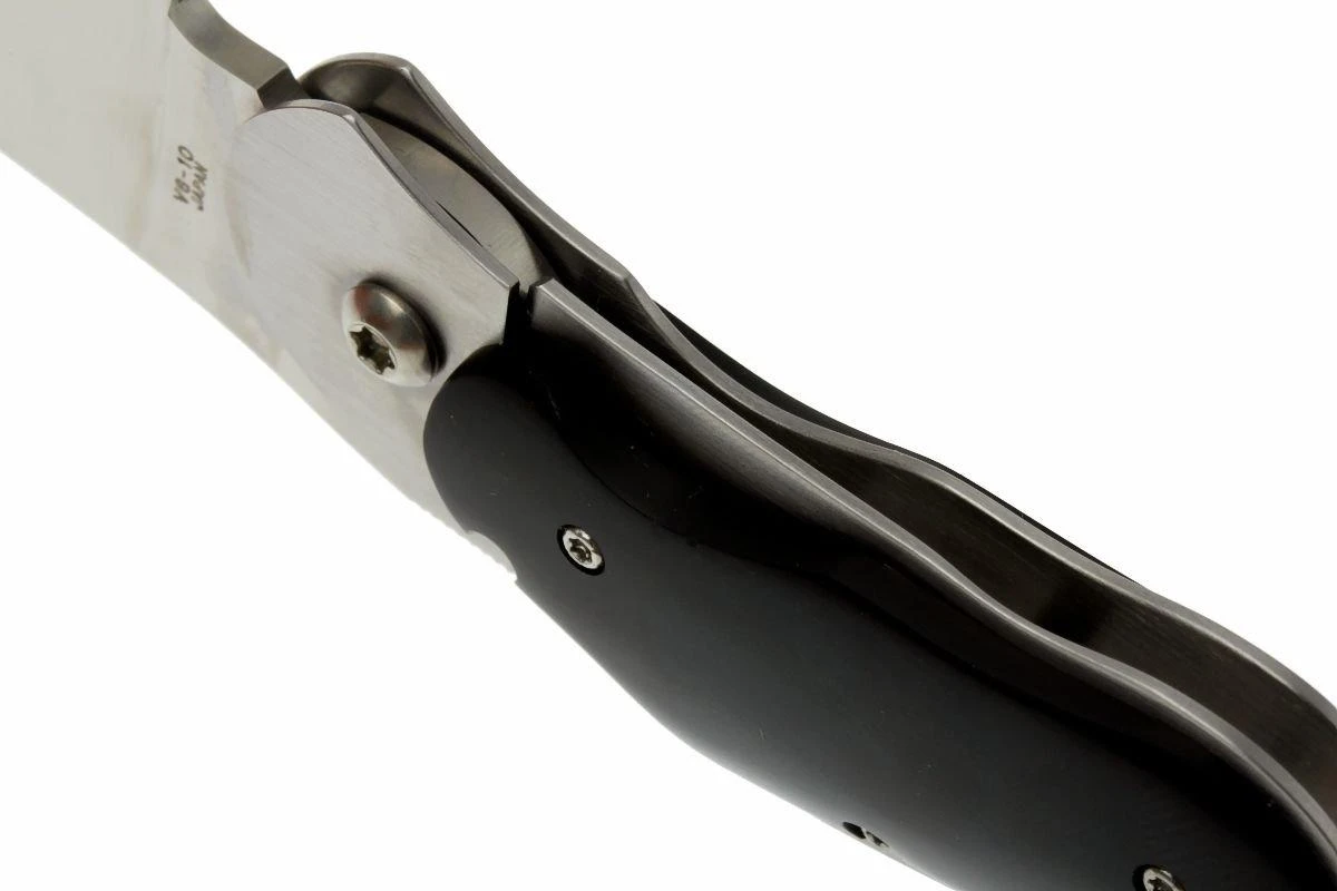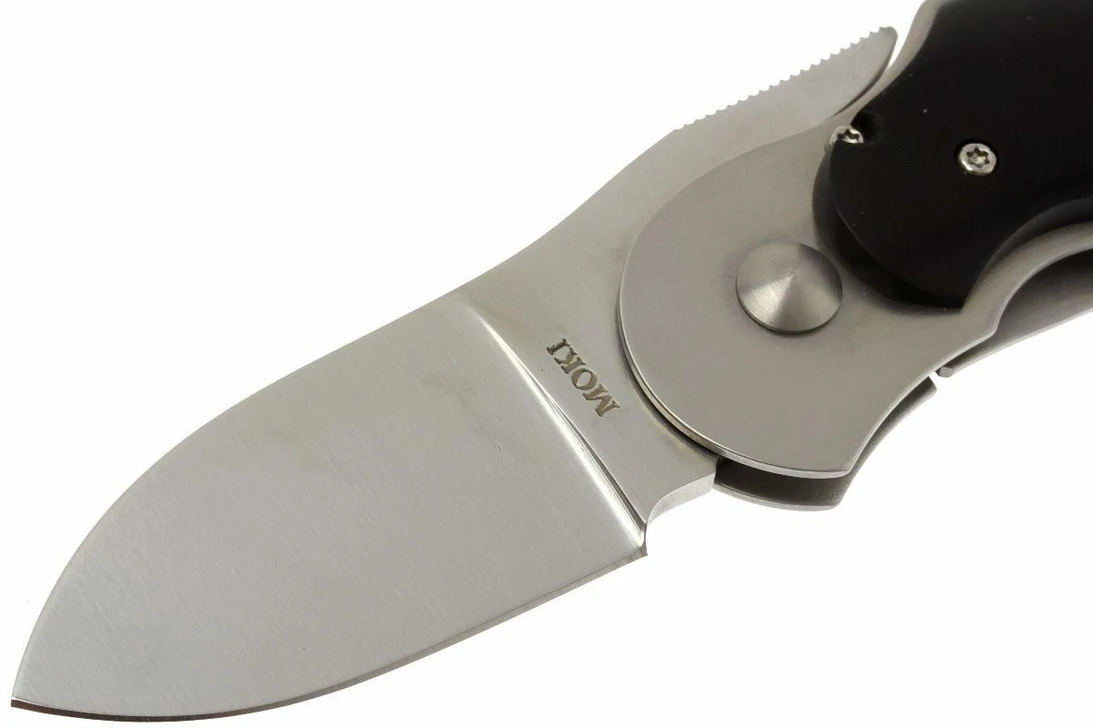 Le Rabbit de Moki est un couteau de poche compact avec une forme très spéciale. Un petit levier permet à la lame de sortir très facilement. Ceci est possible autant avec une qu’avec deux mains. Vu le genre du couteau, souvent vous le ferez à deux mains. Avec votre pouce dans le bombement sur le dos et votre index sur le levier, vous ouvrez de forme naturelle la lame en acier VG10. Par le fait que le couteau soit un peu plus élevé, vous avez énormément de prise. Les nervures sur le levier augmentent encore plus la prise. La lame est verrouillée en position ouverte avec un framelock.