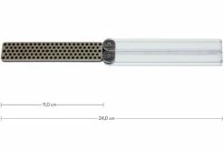 Une pierre à aiguiser Diafold est construite comme un couteau papillon, le manche se replie sur la pierre à aiguiser diamant. La pierre est ainsi parfaitement protégée. Les pierres peuvent être utilisées des deux côtés, chaque face ayant sa propre granulométrie. La couleur du fameux motif à pois caractéristique de DMT indique les différentes tailles de grains.