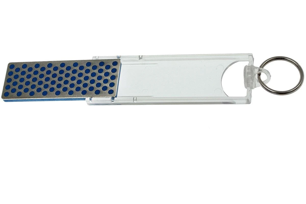On accroche cette pierre à aiguiser compacte à son trousseau de clés afin de toujours avoir la possibilité d’aiguiser avec soi. La taille de la pierre est limitée bien sûr mais c’est tout de même une véritable pierre de qualité DMT. Elle peut donc rendre de grands services.