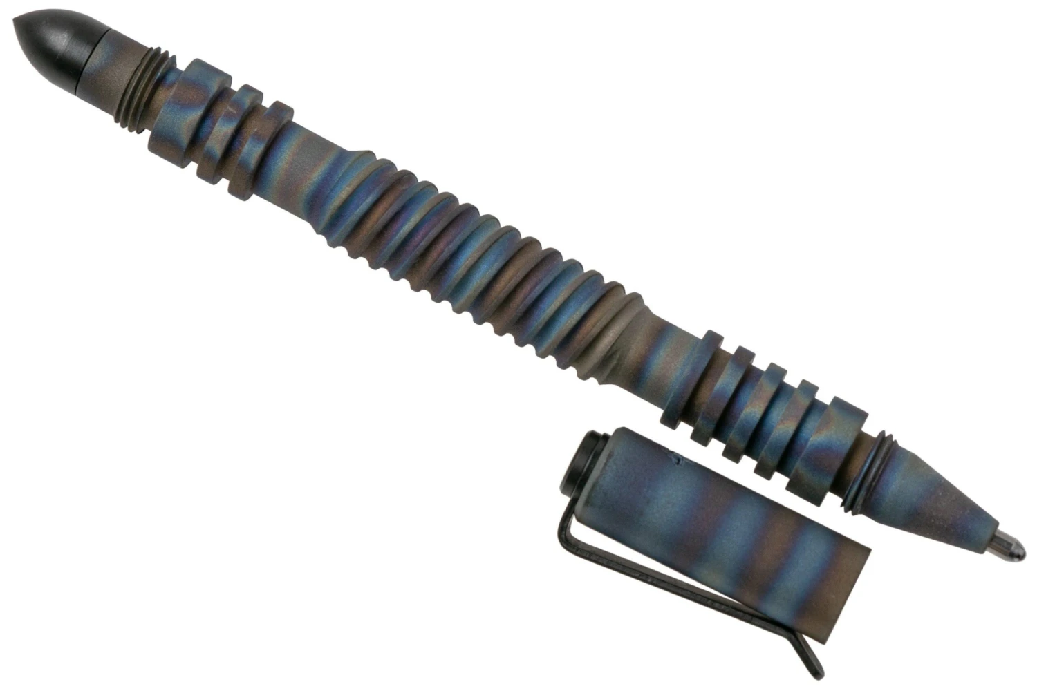Le Rick Hinderer Spiral Investigator Pen est un stylo tactique mince conçu par le fabricant de couteaux Rick Hinderer. Avec une longueur totale de seulement 11,1 cm et un diamètre de 9,4 mm, ce stylo est imperceptible dans votre poche. Le subtil clip de poche maintient le stylo fermement en place, sans qu’on s’en aperçoive. Pour ce qui est de la cartouche, Hinderer a opté pour un remplissage Fisher Space Pen. Cette version Spiral a un motif en spirale sur le côté. C’est là la seule différence avec les stylos Investigator classiques.