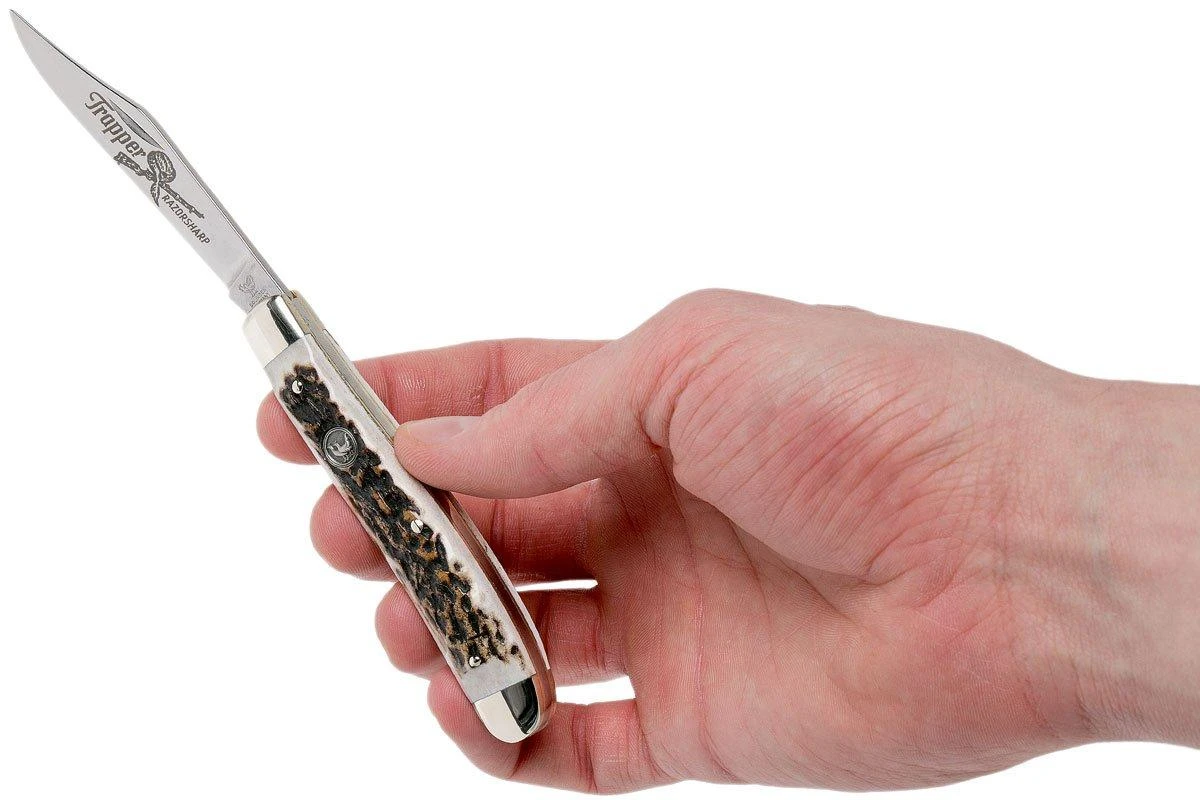 Le Robert Klaas Trapper est un couteau de poche chic et fin, fabriqué à Solingen. Il suit le modèle traditionnel du trappeur, un couteau de chasse classique. Idéal pour l’éviscération de petits gibiers, mais aussi comme couteau pour hommes. Un vrai polyvalent pour être toujours avec vous !