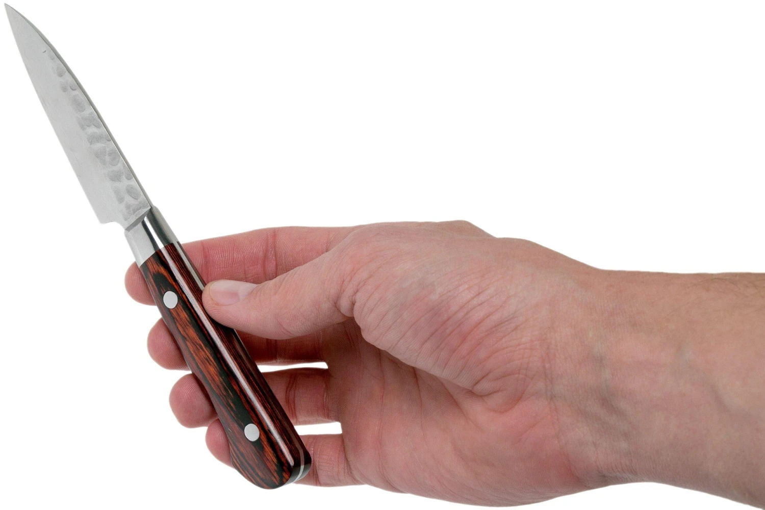 Ce couteau Sakai Takayuki petty de la gamme 33-Layer Damascus a une lame de 8 cm comparable à une lame occidentale. Il est parfait pout les travaux de coupe et d’épluchage précis.