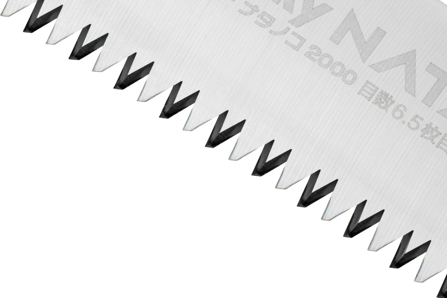 Le Silky Natanoko 2000 330-6.5 est une scie à coupe tirante à lame légèrement courbe au radius de 2000. Comme la lame est légèrement courbe, cette scie permet de travailler au dessus de la tête comme au niveau des hanches. Une bonne option si pour vous, une scie trop courbe ne convient pas. La dentelure grossière permet de scier efficacement le bois vert.
