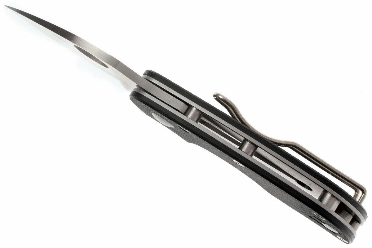Couteau de poche compact de Spyderco. Ce couteau est spĂ©cialement dĂ©veloppĂ© pour pouvoir rĂ©pondre aux exigences sĂ©vères de Chicago, oĂą il est interdit de porter un couteau chez soi avec une lame plus longue que 2″ (environ 5 cm). Ce couteau ne dĂ©passe pas les limites, mais c’est quand mĂŞme un vrai Spyderco qui est idĂ©al pour toutes les personnes qui souhaitent avoir un petit couteau de bonne qualitĂ©. La longueur de la lame est 5,1 cm. Le manche est en G10 avec des platines inoxydables. Le clip-poche se fixe de deux façons et vous permet de porter ce couteau presque invisible dans votre poche de pantalon. Diamètre trou de pouce : 1,2 cm.