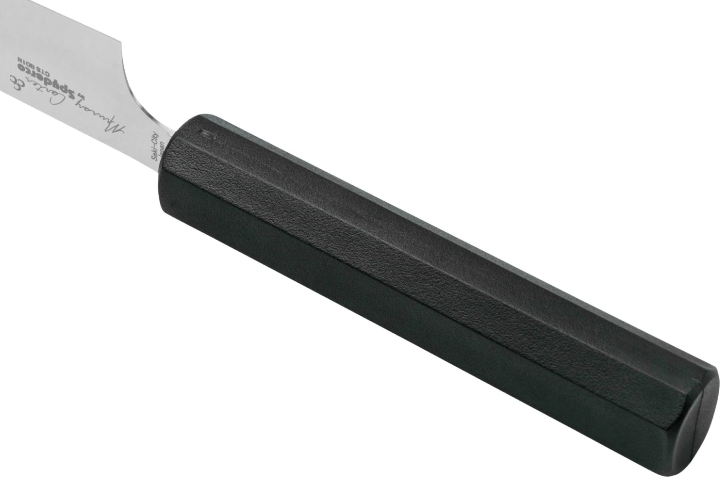 Le Spyderco Minarai Petty de la collection Murray Carter est le plus petit couteau de cuisine de cette gamme. Ce couteau Petty (du français « petit ») est l’équivalent du couteau à éplucher. Idéal pour éplucher et couper les fruits et légumes mais aussi pour préparer des garnitures détaillées permettant de décorer les plats.