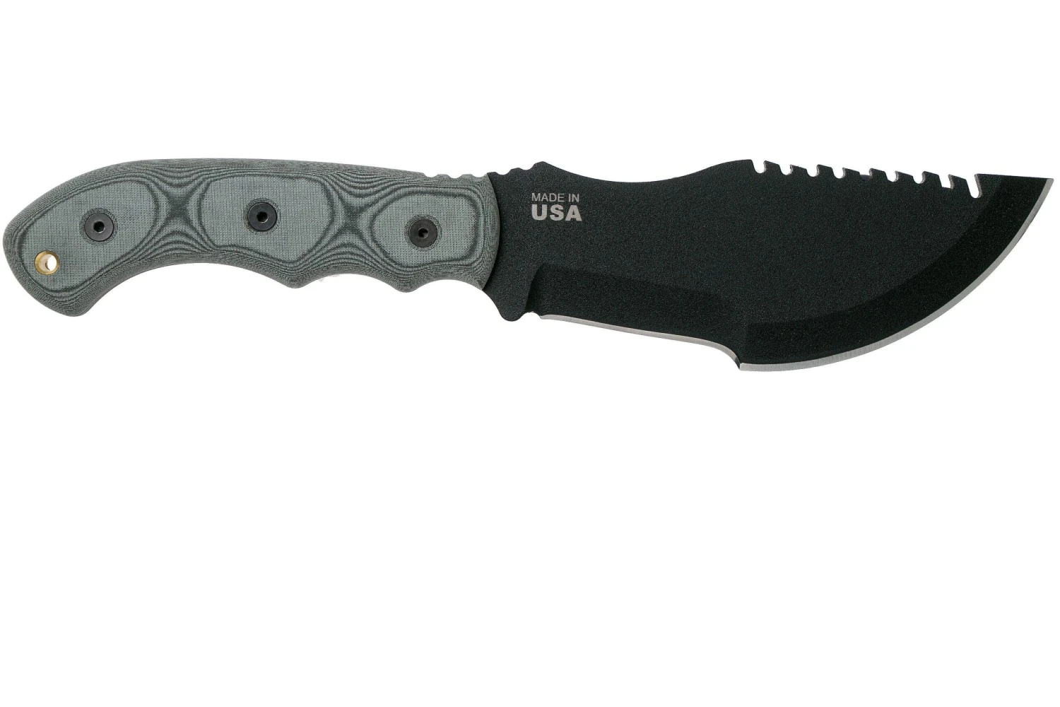 Le TOPS Knives Tom Brown Tracker est un couteau de survie versatile bien particulier. L’impressionnante lame de 7,5 mm d’Ă©paisseur en fait un couteau sacrĂ©ment robuste. Le dos de la lame est dentelĂ© afin de pouvoir s’en servir pour scier. Les premières dentelures sont plus profondes que les autres. Pratique pour couper un fil de fer, par exemple. La courbe de la lame est vraiment utile pour tailler le bois ou encore Ă©viscĂ©rer du gibier. En raison de la forme gĂ©nĂ©rale de la lame, le couteau est Ă©galement très appropriĂ© pour les travaux de coupe plus lĂ©gers. La lame est en acier carbone 1095 et dotĂ©e d’un revĂŞtement Traction Coating prĂ©venant les reflets du soleil. Le manche est en Micarta avec un petit liner rouge. Le Micarta est un très bon matĂ©riau qui dĂ©voile toute sa force dans des conditions humides ou mouillĂ©es.