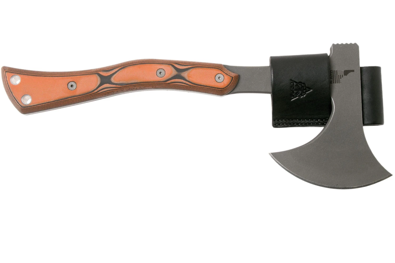 La hache TOPS Knives Ucan Hawk est une hache à fendre idéale pour fendre de plus petits morceaux de bois, branches et même, de petits arbres. La forme de la tête permet d’effectuer très simplement beaucoup de travail manuel. En fait, on tient la hache assez proche du tranchant, ce qui permet pas mal de précision. L’arrière de la tête comporte une section plate et nervurée, du coup, on s’en sert un peu comme d’un marteau. Pratique pour planter les sardines de tente dans le sol, par exemple. Ce modèle est livré avec un étui en cuir.
