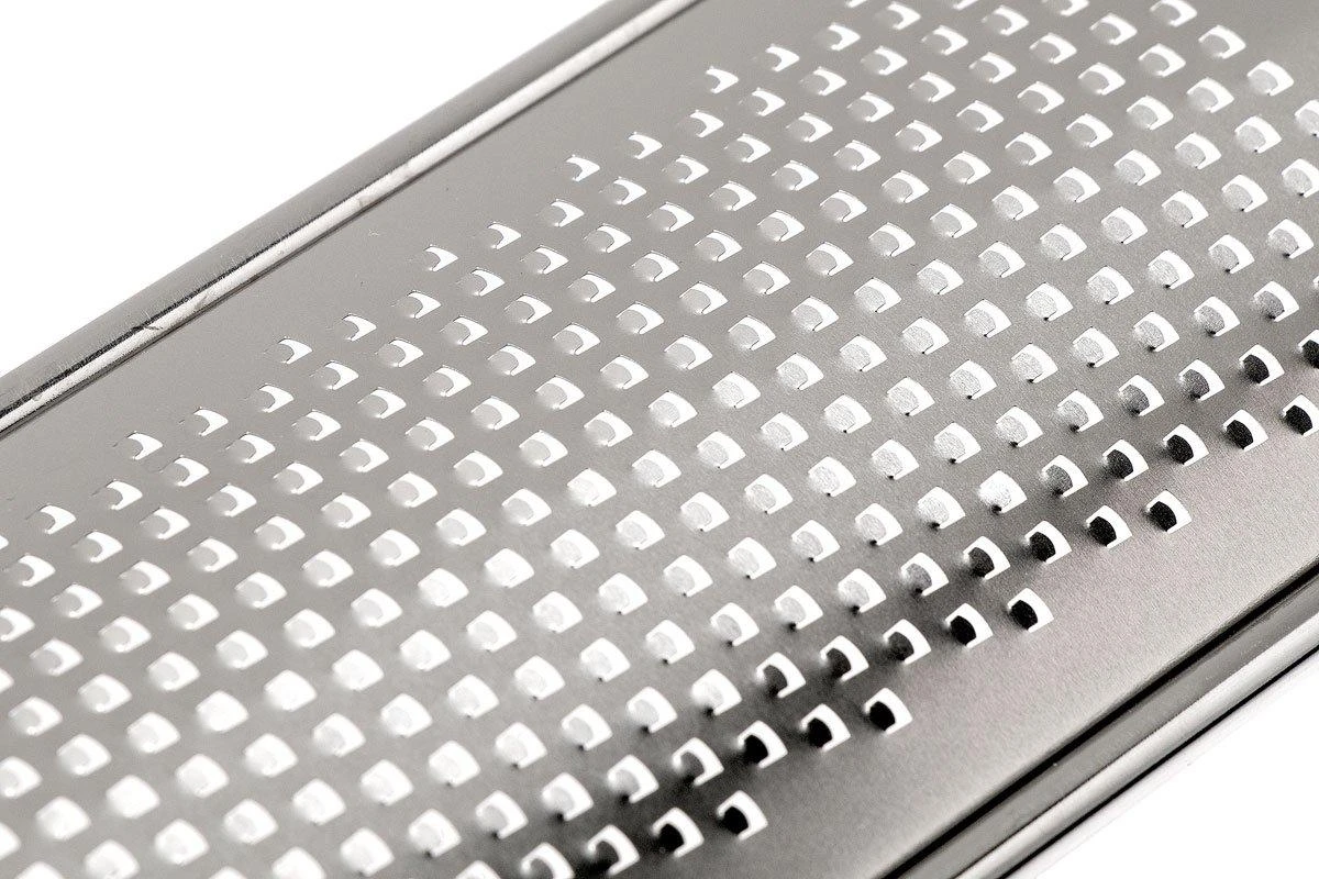 Avec la râpe (à fromage) triangulaire on râpe facilement les fromages à pâte dure et molle. Elle est aussi très bien pour râper finement d’autres ingrédients comme la noix de muscade, le chocolat, le gingembre ou le citron. La râpe peut aller au lave-vaisselle. Elle est entièrement en acier inoxydable et dotée de pieds antidérapants. La râpe reste donc bien en place pendant l’utilisation.