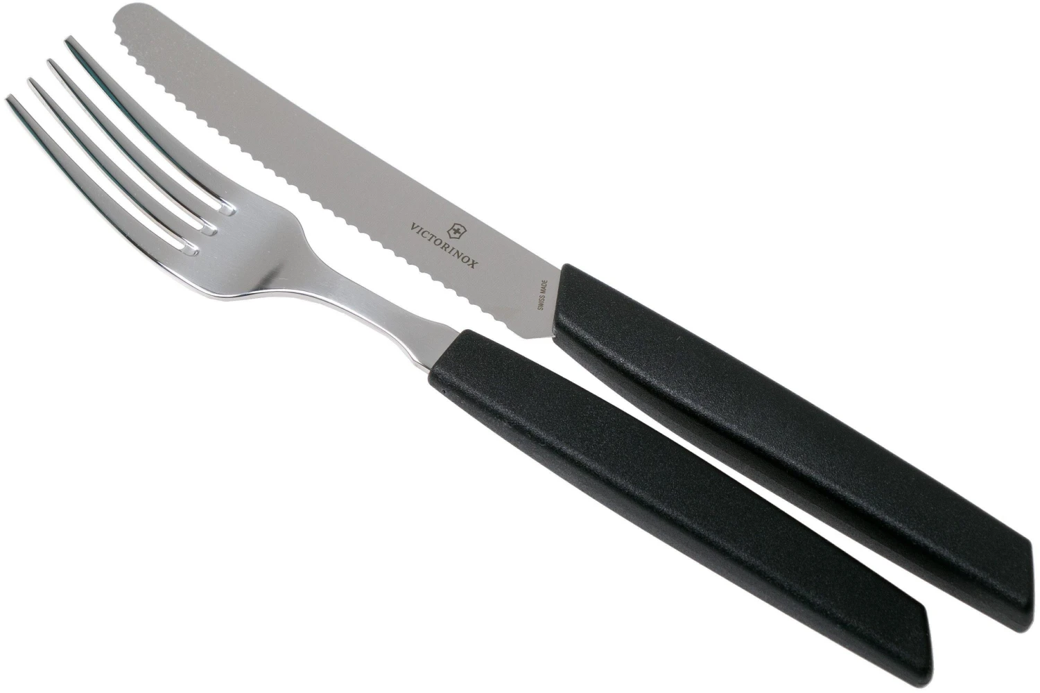 Le set de couverts Victorinox Swiss Modern 12 pièces est un ensemble de 6 couteaux dentelés et 6 fourchettes. Le couteau de ce set est aussi appelé un couteau à tomates, car sa lame dentelée convient particulièrement à la coupe de tomates, en tranchant leur peau sans les écraser. Le couteau à tomate présente une pointe arrondie, contrairement à un couteau à steak. Les couteaux à tomates permettent aussi de couper de la viande, du poisson, des fruits, des petits pains et bien plus encore. Un couteau idéal pour un usage quotidien.