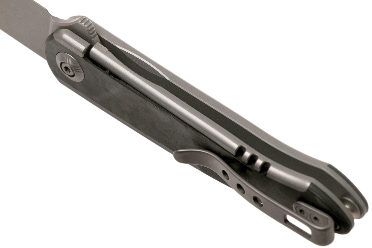 Le WE Knife Smooth Sentinel est un couteau de poche élégant au format compact. Ce qui saute tout de suite aux yeux, c’est la beauté de l’insert dans le manche en titane. D’un bout à l’autre. Pour cette version du Smooth Sentinel, WE Knife a choisi un insert en fibre de carbone, bien chic.